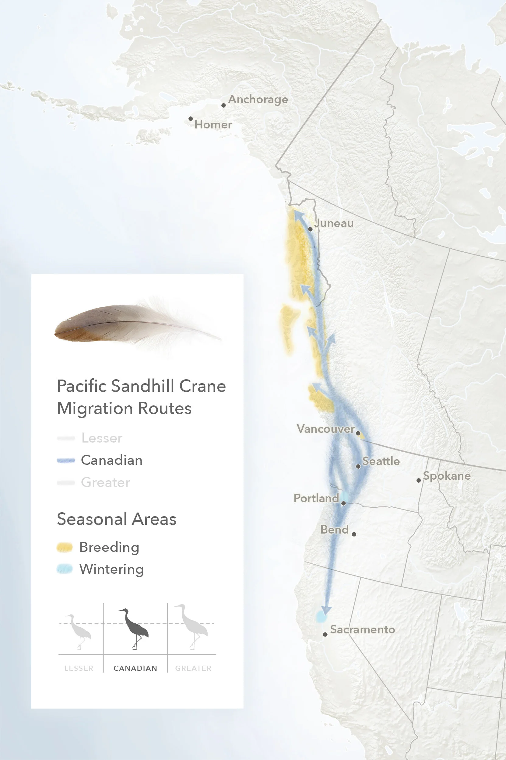 Migration routes, breeding areas, and wintering areas of the Lesser, Canadian, and Greater populations of Pacific sandhill cranes.
